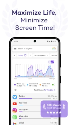 Nagrađivana kao vodeća aplikacija za praćenje vremena zaslona i samokontrolu, StayFree se ističe svojom preciznošću i iznimnom lakoćom korištenja. Nudi sveobuhvatan pregled vašeg digitalnog života na svim platformama – od mobilnog uređaja do desktop računala s Windows, macOS i Linux operativnim sustavima, pa čak i putem proširenja za Chrome, Firefox i Safari preglednike, te aplikacije za Wear OS. Bez potrebe za kreiranjem računa, možete bez napora povezati svoje uređaje i sinkronizirati ograničenja, pružajući ujedinjeno iskustvo blokiranja. Njegov brz i korisniku pristupačan dizajn, uz izostanak oglasa i minimalan utjecaj na bateriju, čini ga idealnim partnerom za digitalni detoks.