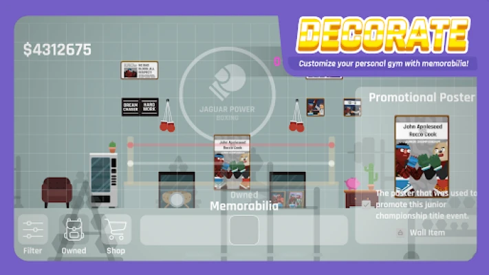 Zaradite novac i izrazite svoju jedinstvenost personalizirajući svog boksača nevjerojatnim izborom kozmetičkih dodataka – frizura, brada, tetovaža, pokrivala za glavu, majica, kratkih hlača, rukavica i cipela, pa čak i emotikona. Ne samo da možete stvoriti savršenog borca, već Super Boxing Championship! vam omogućuje da izgradite i svoju osobnu teretanu koju ćete nazvati domom. Opremite je namještajem, dekorom, omiljenom glazbom i bojama. Tijekom karijere, osvajat ćete uspomene koje ponosno možete izložiti u svojoj teretani, prikazujući svaki korak vašeg epskog putovanja. Uživajte u mečevima s neobičnim pravilima poput borbe jastucima, boksa golim šakama ili načina rada u invalidskim kolicima, dodajući novu dimenziju zabave.